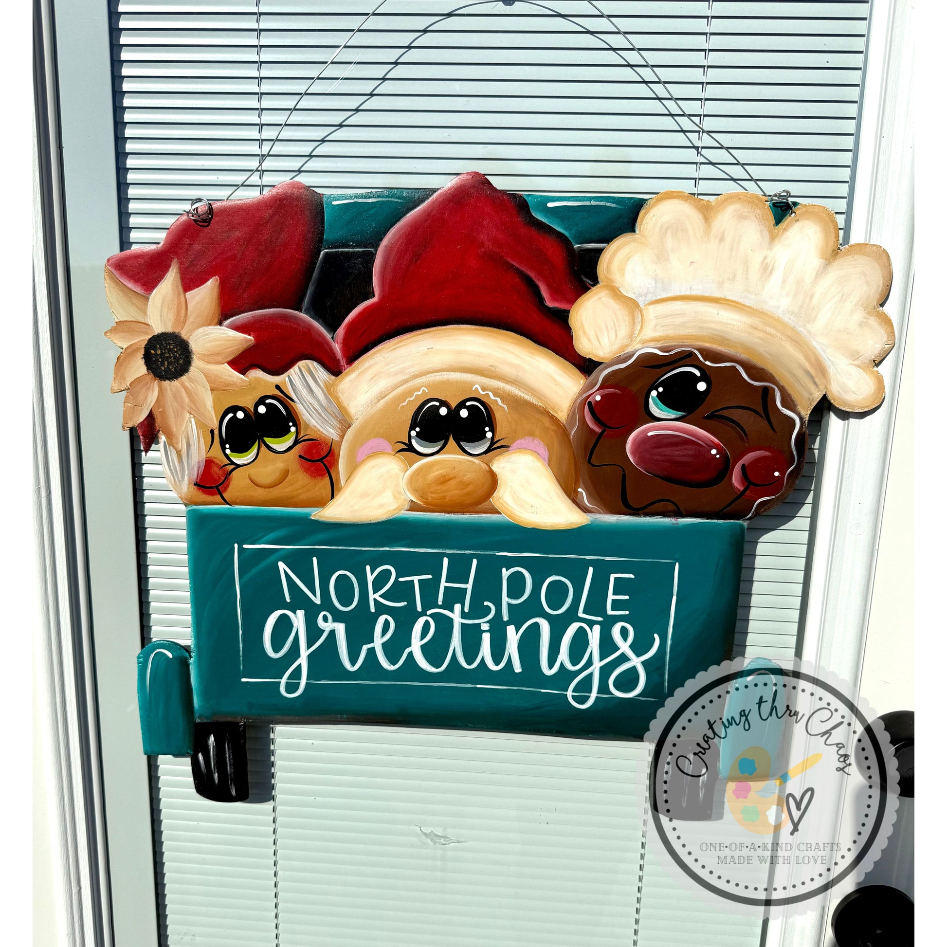 Meet Santa's crew with this handpainted door hanger showcasing three delightful North Pole characters riding in the back of a charming farm truck. This rustic, whimsical design captures the spirit of holiday adventure and small-town Christmas magic. Hand-crafted details bring the festive scene to life, making it a standout decoration that spreads cheer and nostalgia. A playful, heartwarming addition to your seasonal décor that's sure to bring smiles to all who pass by.