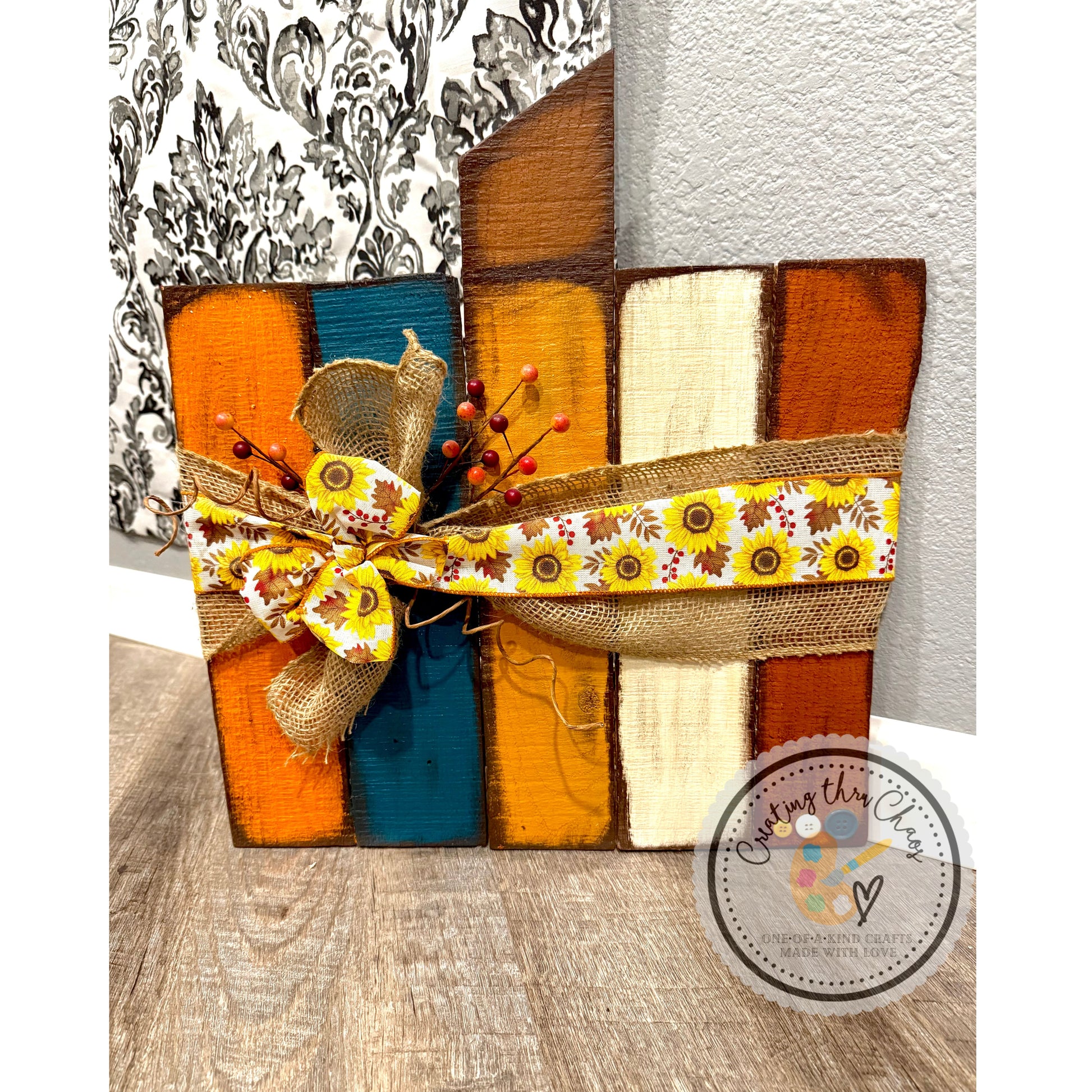 Celebrate the season with this charming Harvest Pallet Pumpkin, handmade from rustic pallet wood. Dressed in rich fall colors and adorned with festive ribbons and delightful embellishments, it brings a cozy, playful touch to your autumn decor. Perfect for adding warmth and character to any space!