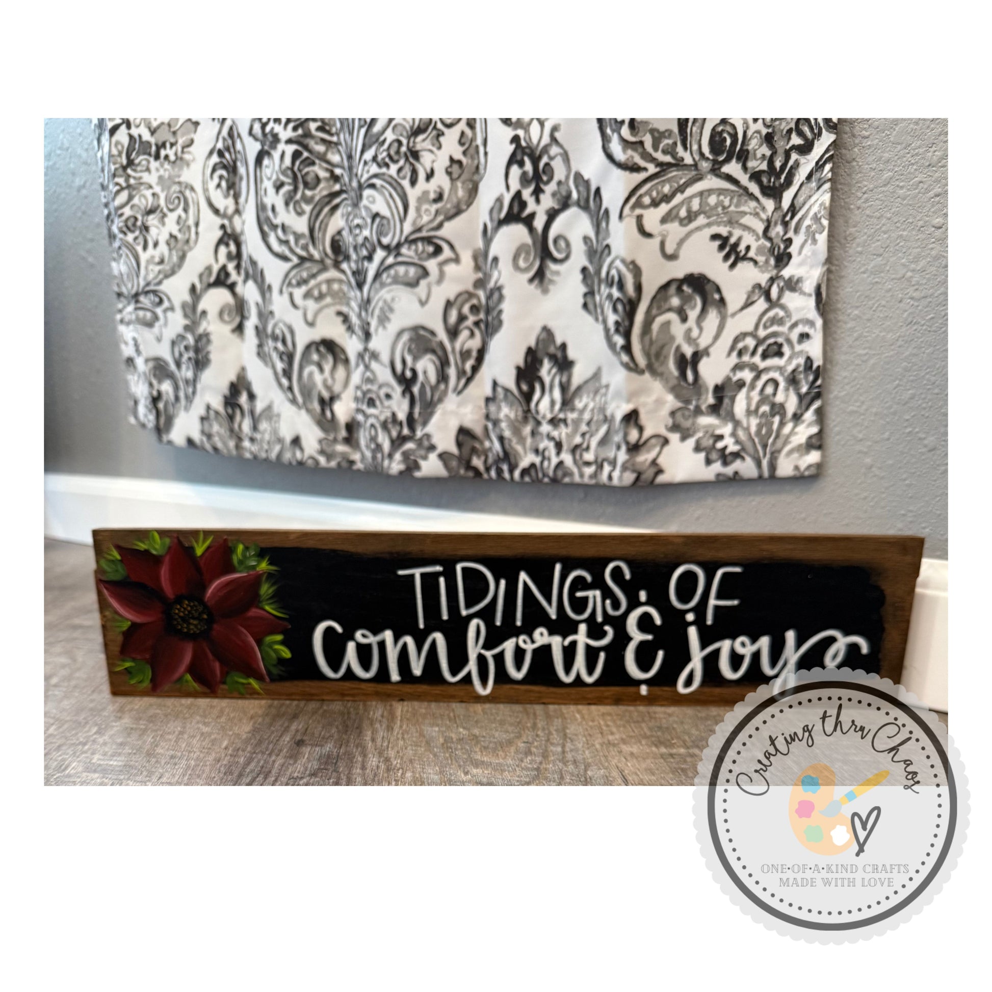 Tidings of Comfort Board - Spread holiday joy with this hand-painted rustic hardwood board showcasing an elegant poinsettia and a timeless Christmas message. This artisanal piece brings traditional festive beauty to entryways, living rooms, or mantels with its classic design and rustic charm. A meaningful gift for those who cherish enduring holiday traditions and handcrafted décor that radiates warmth and seasonal comfort.
