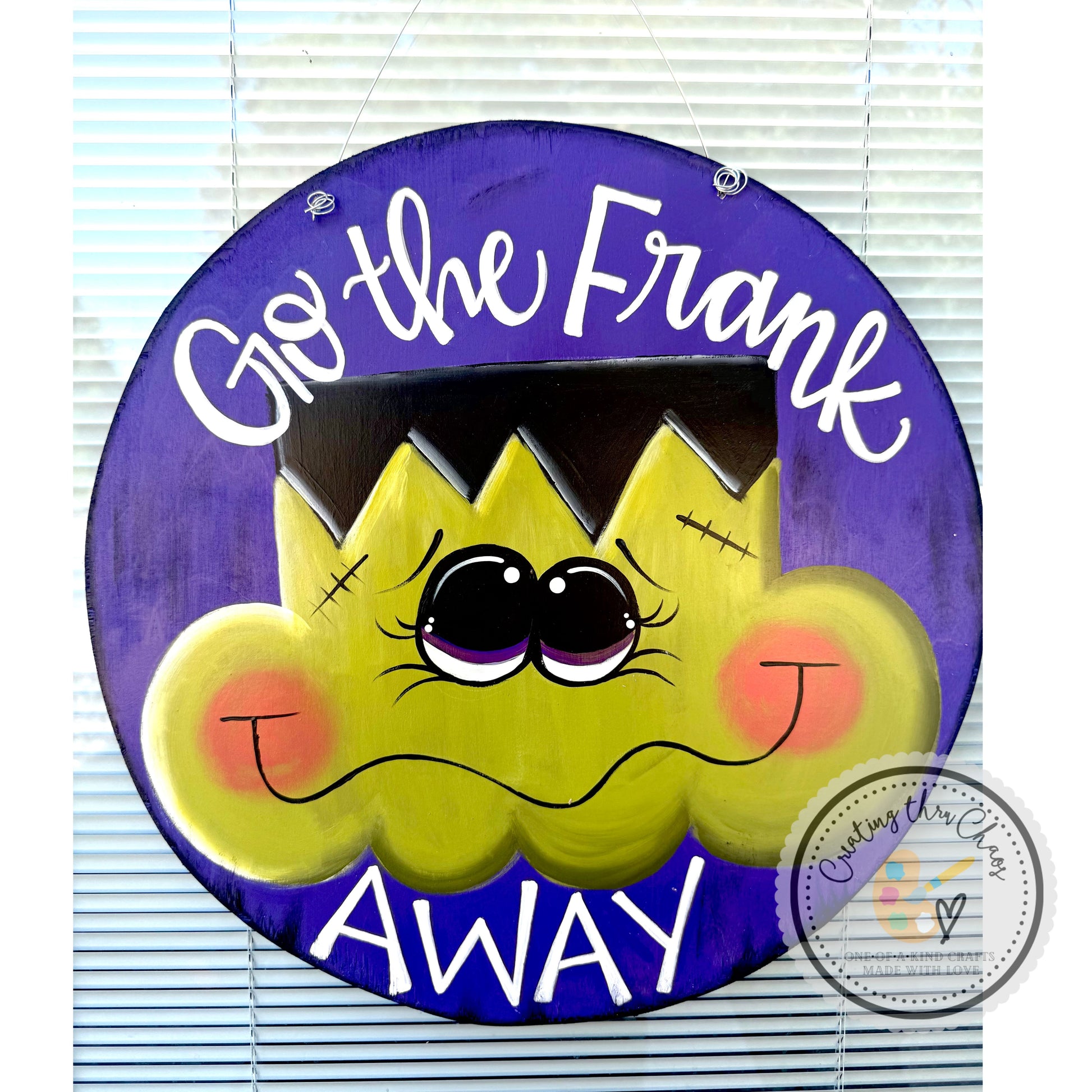 Bring a playful touch to your Halloween decor with this handpainted "Go the Frank Away" door hanger. Made from sturdy 1/4 inch thick plywood, it features a cute Frankenstein design paired with a catchy phrase that’s sure to make guests smile. Perfect for adding charm and a little spooky fun to any entryway.