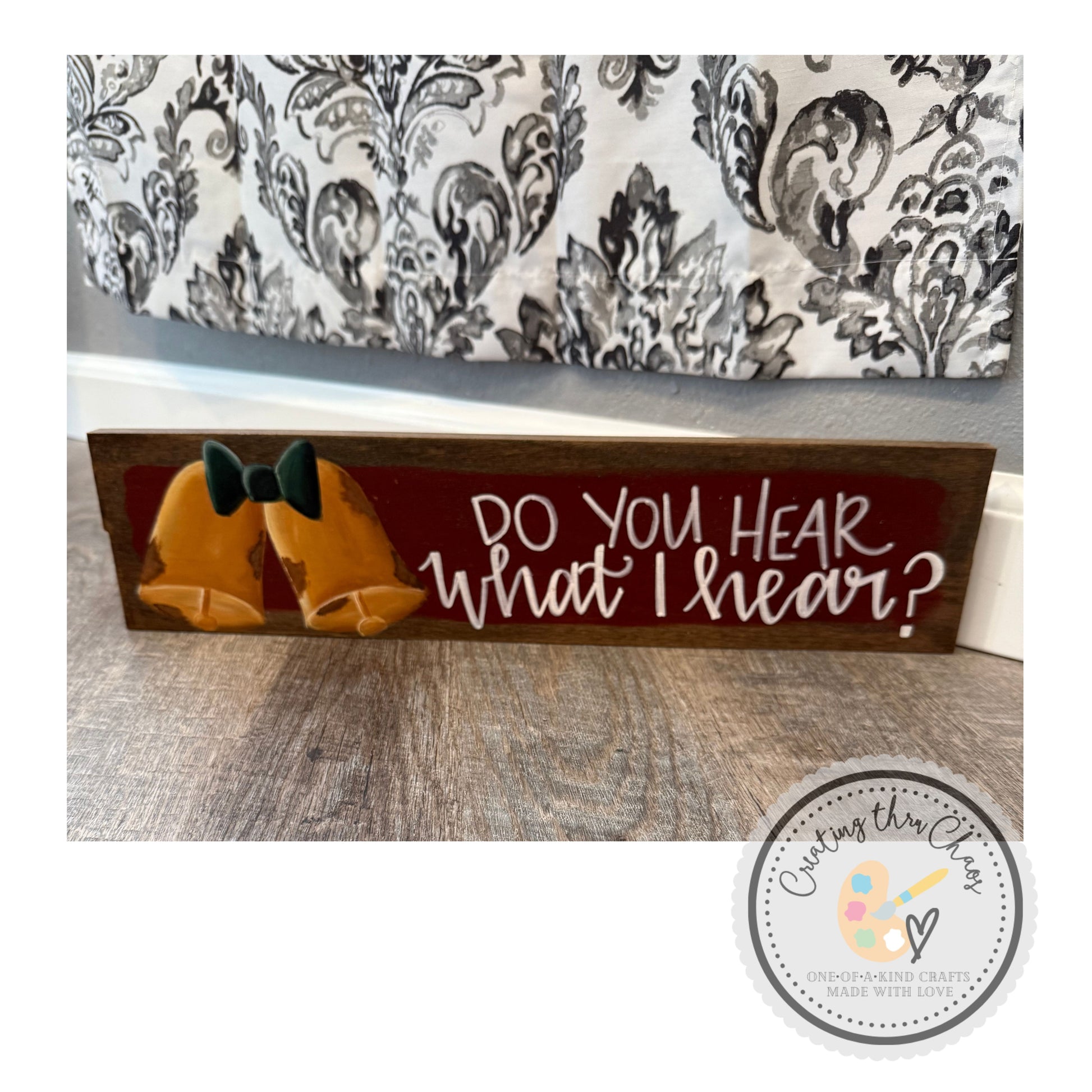 Say hello to the Do You Hear What I Hear Board—a delightful Christmas bell-themed sign handpainted on rustic hardwood. This festive piece rings in the season with cheerful charm and nostalgic appeal, perfect for spreading holiday joy throughout your home. With its artisanal brushwork and warm rustic finish, it's a standout addition to any seasonal display.
