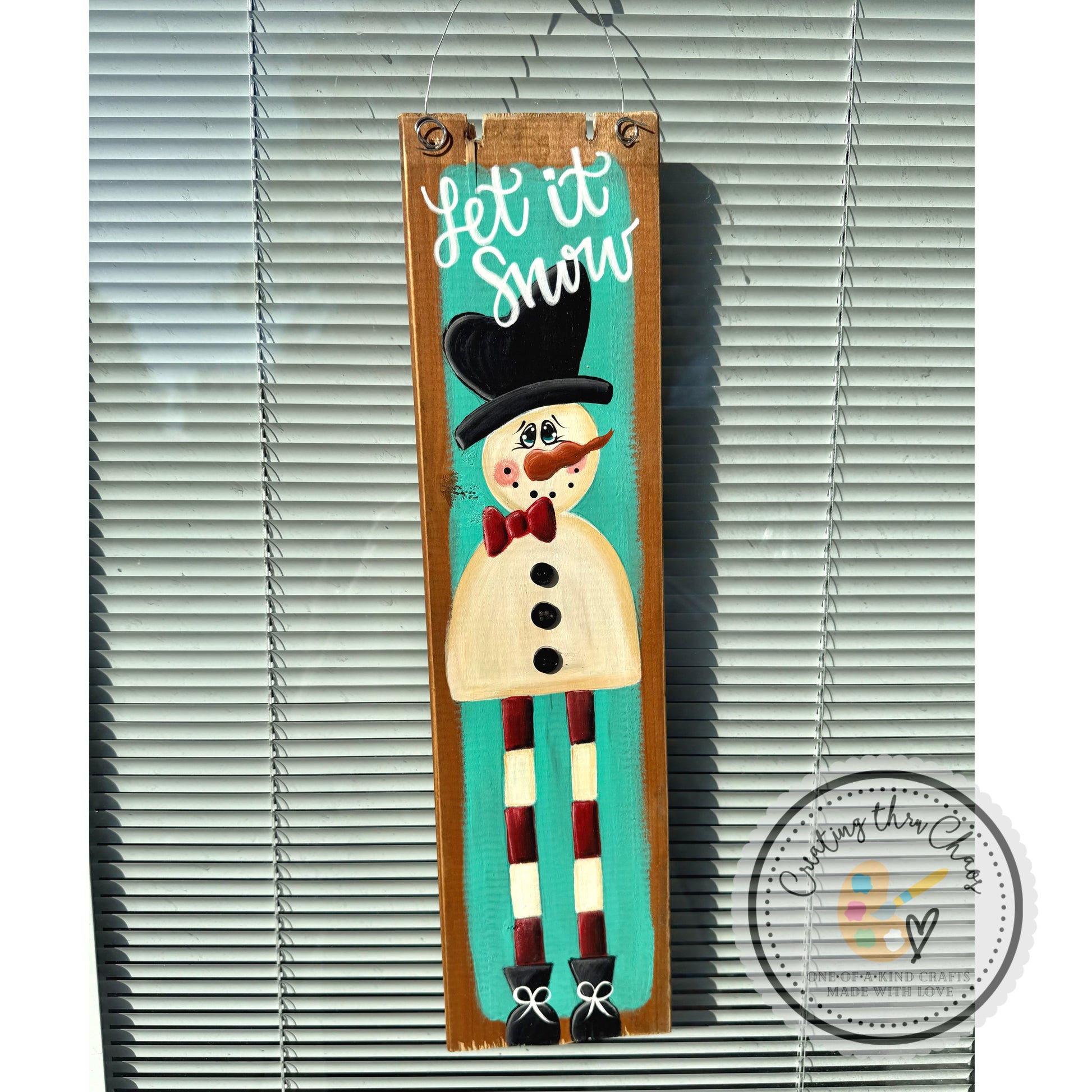 Say hello to a whimsical snowman with personality to spare—complete with long, quirky legs and a fun bow tie. Hand-painted on rustic cedar wood, this playful character brings laughter and holiday cheer to any room. A one-of-a-kind piece that celebrates the joy of the season with artisanal flair.